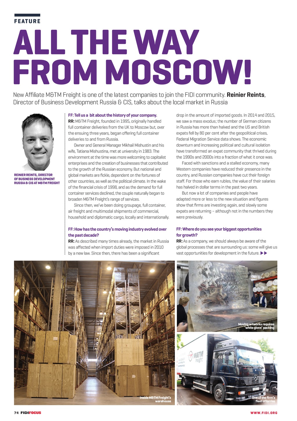 F E AT U R E ALL THE WAY FROM MOSCOW! New Affiliate M&TM Freight is one of the latest companies to join the FIDI community. Reinier Reints, Director of Business Development Russia & CIS, talks about the local market in Russia REINIER REINTS, DIRECTOR OF BUSINESS DEVELOPMENT RUSSIA & CIS AT M&TM FREIGHT FF: Tell us a bit about the history of your company. RR: M&TM Freight, founded in 1995, originally handled full container deliveries from the UK to Moscow but, over the ensuing three years, began offering full container deliveries to and from Russia. Owner and General Manager Mikhail Mishustin and his wife, Tatiana Mishustina, met at university in 1983. The environment at the time was more welcoming to capitalist enterprises and the creation of businesses that contributed to the growth of the Russian economy. But national and global markets are fickle, dependent on the fortunes of other countries, as well as the political climate. In the wake of the financial crisis of 1998, and as the demand for full container services declined, the couple naturally began to broaden M&TM Freights range of services. Since then, weve been doing groupage, full container, air freight and multimodal shipments of commercial, household and diplomatic cargo, locally and internationally. drop in the amount of imported goods. In 2014 and 2015, we saw amass exodus; thenumber ofGerman citizens inRussia has more than halved and the US and British expats fell by 80 per cent after the geopolitical crises, Federal Migration Service data shows. Theeconomic downturn andincreasing political andcultural isolation have transformed anexpat community that thrived during the1990s and2000s into a fraction of what it once was. Faced with sanctions and a stalled economy, many Western companies have reduced their presence inthe country, andRussian companies have cut their foreign staff. Forthose who earn rubles, thevalue oftheir salaries has halved indollar terms in the past two years. But now a lot of companies and people have adaptedmore or less to the new situation and figures show that firms are investing again, and slowly some expats are returning although not in the numbers they were previously. FF: How has the countrys moving industry evolved over the past decade? RR: As described many times already, the market in Russia was affected when import duties were imposed in 2010 by a new law. Since then, there has been a significant FF: Where do you see your biggest opportunities forgrowth? RR: As a company, we should always be aware of the global processes that are surrounding us: some will give us vast opportunities for development in the future. Moving artworks requires white glove packing Inside M&TM Freights warehouse 74 FF290 pp74-77 New Affiliate M&TM Freight.indd 74 One of the firms fleet of lorries WWW. F I D I . OR G 13/03/2019 12:10
