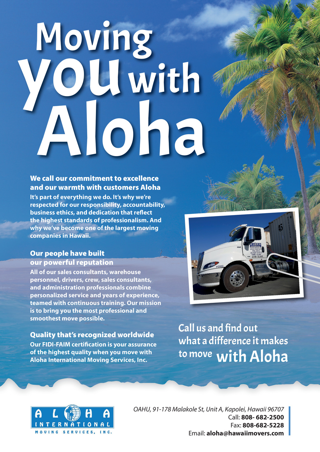 Moving with you Aloha We call our commitment to excellence and our warmth with customers Aloha Its part of everything we do. Its why were respected for our responsibility, accountability, business ethics, and dedication that reflect the highest standards of professionalism. And why weve become one of the largest moving companies in Hawaii. Our people have built our powerful reputation All of our sales consultants, warehouse personnel, drivers, crew, sales consultants, and administration professionals combine personalized service and years of experience, teamed with continuous training. Our mission is to bring you the most professional and smoothest move possible. Quality thats recognized worldwide Our FIDI-FAIM certification is your assurance of the highest quality when you move with Aloha International Moving Services, Inc. Call us and nd out what a difference it makes to move with Aloha OAHU, 91-178 Malakole St, Unit A, Kapolei, Hawaii 96707 Call: 808- 682-2500 Fax: 808-682-5228 Email: aloha@hawaiimovers.com FF298 AugSept20 pp23-27 Yan Blandy.indd 24 Aloha.indd 1 20/07/2020 04/09/2019 16:00 14:43