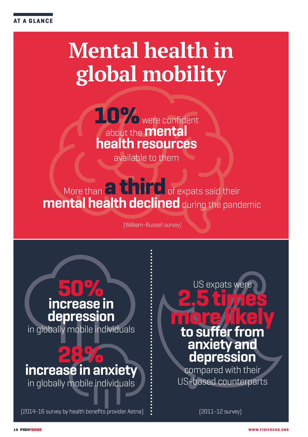 AT A G L A N C E Mental health in global mobility 10% were confident about the mental health resources available to them More than a third of expats said their mental health declined during the pandemic (William-Russell survey) 50% increase in depression in globally mobile individuals 28% increase in anxiety in globally mobile individuals (2014-16 survey by health benefits provider Aetna) 18 FF303 Sept_Nov 21 pp18 Glance.indd 18 US expats were 2.5 times more likely to suffer from anxiety and depression compared with their US-based counterparts (2011-12 survey) WWW. F I D I FOC U S . OR G 14/09/2021 14:08