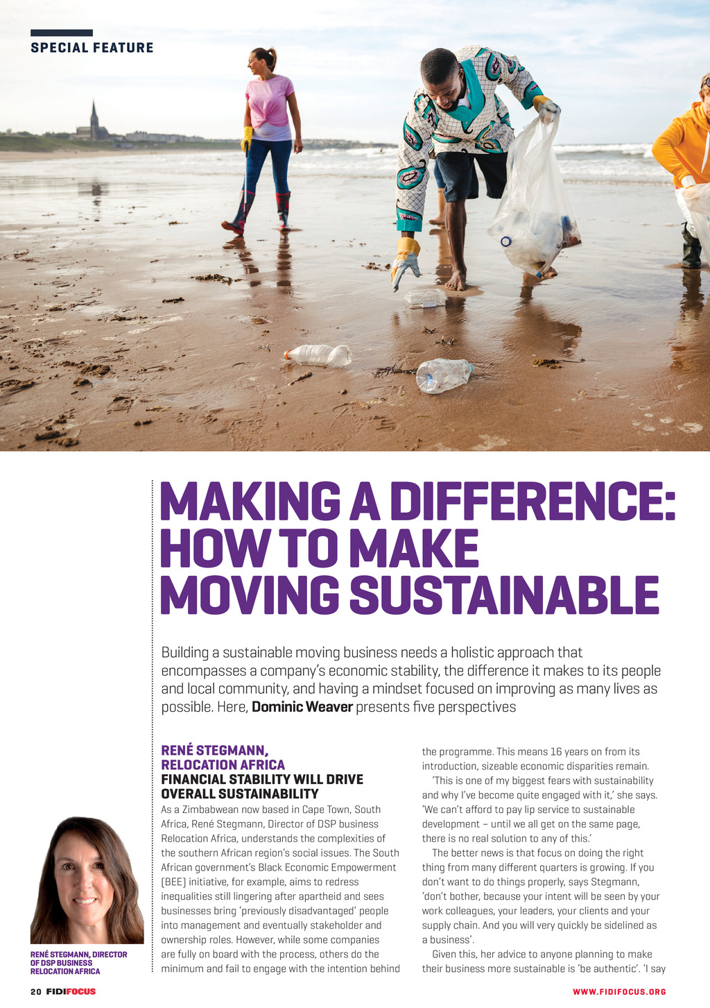 SPECIAL FEATURE MAKING A DIFFERENCE: HOW TO MAKE MOVING SUSTAINABLE Building a sustainable moving business needs a holistic approach that encompasses a companys economic stability, the difference it makes to its people and local community, and having a mindset focused on improving as many lives as possible. Here, Dominic Weaver presents five perspectives REN STEGMANN, RELOCATION AFRICA FINANCIAL STABILITY WILL DRIVE OVERALL SUSTAINABILITY REN STEGMANN, DIRECTOR OF DSP BUSINESS RELOCATION AFRICA As a Zimbabwean now based in Cape Town, South Africa, Ren Stegmann, Director of DSP business Relocation Africa, understands the complexities of the southern African regions social issues. The South African governments Black Economic Empowerment (BEE) initiative, for example, aims to redress inequalities still lingering after apartheid and sees businesses bring previously disadvantaged people into management and eventually stakeholder and ownership roles. However, while some companies are fully on board with the process, others do the minimum and fail to engage with the intention behind 20 FF303 Sept_Nov 21 pp20-29 Sustainable Business.indd 20 the programme. This means 16 years on from its introduction, sizeable economic disparities remain. This is one of my biggest fears with sustainability and why Ive become quite engaged with it, she says. We cant afford to pay lip service to sustainable development until we all get on the same page, there is no real solution to any of this. The better news is that focus on doing the right thing from many different quarters is growing. If you dont want to do things properly, says Stegmann, dont bother, because your intent will be seen by your work colleagues, your leaders, your clients and your supply chain. And you will very quickly be sidelined as a business. Given this, her advice to anyone planning to make their business more sustainable is be authentic. I say WWW. F I D I FOC U S . OR G 15/09/2021 10:58