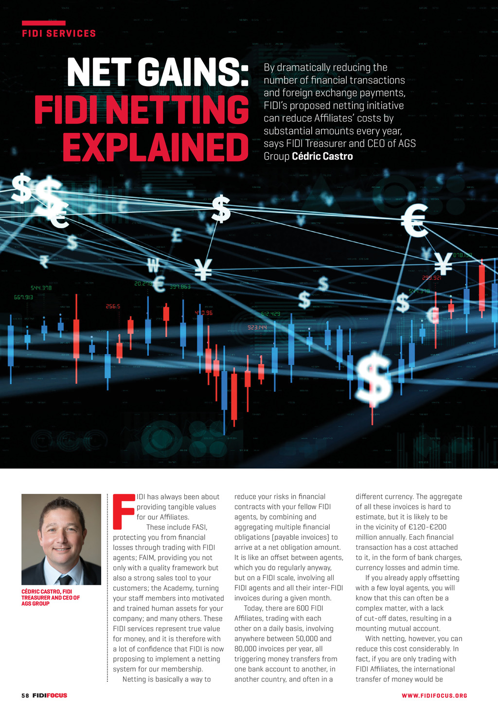 F IDI S E RV I C E S NET GAINS: FIDI NETTING EXPLAINED F CDRIC CASTRO, FIDI TREASURER AND CEO OF AGS GROUP IDI has always been about providing tangible values for our Affiliates. These include FASI, protecting you from financial losses through trading with FIDI agents; FAIM, providing you not only with a quality framework but also a strong sales tool to your customers; the Academy, turning your staff members into motivated and trained human assets for your company; and many others. These FIDI services represent true value for money, and it is therefore with a lot of confidence that FIDI is now proposing to implement a netting system for our membership. Netting is basically a way to 58 FF303 Sept_Nov 21 pp58-60 NettingProject.indd 58 By dramatically reducing the number of financial transactions and foreign exchange payments, FIDIs proposed netting initiative can reduce Affiliates costs by substantial amounts every year, says FIDI Treasurer and CEO of AGS Group Cdric Castro reduce your risks in financial contracts with your fellow FIDI agents, by combining and aggregating multiple financial obligations (payable invoices) to arrive at a net obligation amount. It is like an offset between agents, which you do regularly anyway, but on a FIDI scale, involving all FIDI agents and all their inter-FIDI invoices during a given month. Today, there are 600 FIDI Affiliates, trading with each other on a daily basis, involving anywhere between 50,000 and 80,000 invoices per year, all triggering money transfers from one bank account to another, in another country, and often in a different currency. The aggregate of all these invoices is hard to estimate, but it is likely to be in the vicinity of 120-200 million annually. Each financial transaction has a cost attached to it, in the form of bank charges, currency losses and admin time. If you already apply offsetting with a few loyal agents, you will know that this can often be a complex matter, with a lack of cut-off dates, resulting in a mounting mutual account. With netting, however, you can reduce this cost considerably. In fact, if you are only trading with FIDI Affiliates, the international transfer of money would be WWW. F I D I FOC U S . OR G 15/09/2021 11:03
