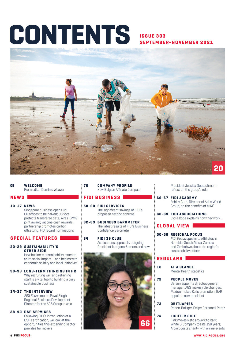 CONTENTS IS S UE 3 0 3 S EPTEMBER-NOV EMBER 2 0 2 1 20 09 W ELC O ME From editor Dominic Weaver 70C OM PA N Y PR OF IL E New Belgian Affiliate Compas NE W S FI DI BUS INES S 10- 1 7 NEW S Singapore business opens up; EU offices to be halved; US vote protects transferee data; Aires KPMG joint award; vaccine cash rewards; partnership promotes carbon offsetting; FIDI Board nominations 58- 60 F IDI SE RV IC E S The significant savings of FIDIs proposed netting scheme S P E C I A L FE ATUR ES 20-2 9 S U STA I NA B I L I TY S OT HER S I DE How business sustainability extends to its social impact and begins with economic solidity and local initiatives President Jessica Deutschmann reflect on the groups role 62- 63BUSIN E SS BA R OM E TE R The latest results of FIDIs Business Confidence Barometer . 64F IDI 39 C L UB As elections approach, outgoing President Morgana Somers and new FF303 Sept_Nov 21 pp06-07 Contents.indd 6 G LOBA L V IEW 50-56R E GION A L FOC US FIDI Focus speaks to Affiliates in Namibia, South Africa, Zambia and Zimbabwe about the regions sustainability efforts 18AT A GL A N C E Mental health statistics 72PE OPL E M OV E S Gerson appoints director/general manager; AGS makes role changes; Paxton makes Kolls promotion; BAR appoints new president 34-3 7 T HE I NT ERV I E W FIDI Focus meets Payal Singh, Regional Business Development Director for the AGS Group in Asia 6 68-69F IDI ASSOC IATI ONS Lydia Cope explains how they work . REGULA RS 30-3 3 LO NG-T ER M TH I N K I N G I N H R Why recruiting well and retaining staff is a vital tool to building a truly sustainable business 38-4 4 D S P S ERV I CE S Following FIDIs introduction of a DSP certification, we look at the opportunities this expanding sector provides for movers 66-67F IDI AC A DE M Y Ashley Gorb, Director of Atlas World Group, on the benefits of MiM2 73OBITUA R IE S Robert Bolliger, Felipe Carbonell Prez 66 74L IGH TE R SIDE Fink moves Neto artwork to Italy; White & Company toasts 150 years; Arpin boosts charity with online events WWW. F I D I FOC U S . OR G 15/09/2021 10:52