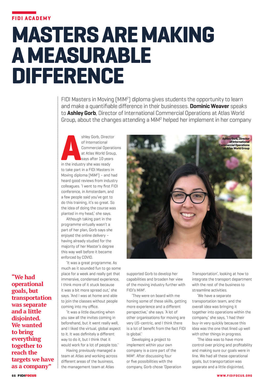 F IDI AC A D E MY MASTERS ARE MAKING A MEASURABLE DIFFERENCE FIDI Masters in Moving (MIM2) diploma gives students the opportunity to learn and make a quantifiable difference in their businesses. Dominic Weaver speaks to Ashley Gorb, Director of International Commercial Operations at Atlas World Group, about the changes attending a MiM2 helped her implement in her company A We had operational goals, but transportation was separate and a little disjointed. We wanted to bring everything together to reach the targets we have as a company shley Gorb, Director of International Commercial Operations at Atlas World Group, says after 10 years in the industry she was ready to take part in a FIDI Masters in Moving diploma (MiM2) and had heard good reviews from industry colleagues. I went to my first FIDI conference, in Amsterdam, and a few people said youve got to do this training, its so great. So the idea of doing the course was planted in my head, she says. Although taking part in the programme virtually wasnt a part of her plan, Gorb says she enjoyed the online delivery having already studied for the majority of her Masters degree this way well before it became enforced by COVID. It was a great programme. As much as it sounded fun to go some place for a week and really get that immersive, condensed experience, I think more of it stuck because it was a bit more spread out, she says. And I was at home and able to join the classes without people coming into my office. It was a little daunting when you saw all the invites coming in beforehand, but it went really well, and I liked the virtual, global aspect to it. It was definitely a different way to do it, but I think that it would work for a lot of people too. Having previously managed a team at Atlas and working across different areas of the business, the management team at Atlas 66 FF303 Sept_Nov 21 pp66-67 Academy.indd 66 Ashley Gorb, Director of International Commercial Operations at Atlas World Group supported Gorb to develop her capabilities and broaden her view of the moving industry further with FIDIs MiM2. They were on board with me honing some of these skills, getting more experience and a different perspective, she says. A lot of other organisations for moving are very US-centric, and I think there is a lot of benefit from the fact FIDI is global. Developing a project to implement within your own company is a core part of the MiM2. After discussing four or five possibilities with the company, Gorb chose Operation Transportation, looking at how to integrate the transport department with the rest of the business to streamline activities. We have a separate transportation team, and the overall idea was bringing it together into operations within the company, she says, I had their buy-in very quickly because this idea was the one that lined up well with other things in progress. The idea was to have more control over pricing and profitability and making sure our goals were in line. We had all these operational goals, but transportation was separate and a little disjointed, WWW. F I D I FOC U S . OR G 14/09/2021 17:19