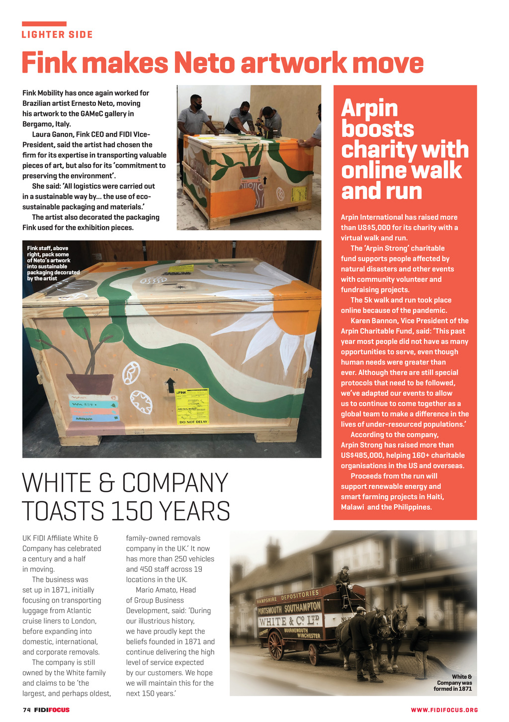 L IG H T E R S I D E Fink makes Neto artwork move Fink Mobility has once again worked for Brazilian artist Ernesto Neto, moving his artwork to the GAMeC gallery in Bergamo, Italy. Laura Ganon, Fink CEO and FIDI VIcePresident, said the artist had chosen the firm for its expertise in transporting valuable pieces of art, but also for its commitment to preserving the environment. She said: All logistics were carried out in a sustainable way by the use of ecosustainable packaging and materials. The artist also decorated the packaging Fink used for the exhibition pieces. Fink staff, above right, pack some of Netos artwork into sustainable packaging decorated by the artist WHITE & COMPANY TOASTS 150 YEARS UK FIDI Affiliate White & Company has celebrated a century and a half in moving. The business was set up in 1871, initially focusing on transporting luggage from Atlantic cruise liners to London, before expanding into domestic, international, and corporate removals. The company is still owned by the White family and claims to be the largest, and perhaps oldest, 74 FF303 Sept_Nov 21 pp74-76 Lighter Side.indd 74 family-owned removals company in the UK. It now has more than 250 vehicles and 450 staff across 19 locations in the UK. Mario Amato, Head of Group Business Development, said: During our illustrious history, we have proudly kept the beliefs founded in 1871 and continue delivering the high level of service expected by our customers. We hope we will maintain this for the next 150 years. Arpin boosts charity with online walk and run Arpin International has raised more than US$5,000 for its charity with a virtual walk and run. The Arpin Strong charitable fund supports people affected by natural disasters and other events with community volunteer and fundraising projects. The 5k walk and run took place online because of the pandemic. Karen Bannon, Vice President of the Arpin Charitable Fund, said: This past year most people did not have as many opportunities to serve, even though human needs were greater than ever. Although there are still special protocols that need to be followed, weve adapted our events to allow us to continue to come together as a global team to make a difference in the lives of under-resourced populations. According to the company, Arpin Strong has raised more than US$485,000, helping 160+ charitable organisations in the US and overseas. Proceeds from the run will support renewable energy and smart farming projects in Haiti, Malawi and the Philippines. White & Company was formed in 1871 WW W. F I D I FOC U S . OR G 14/09/2021 17:25