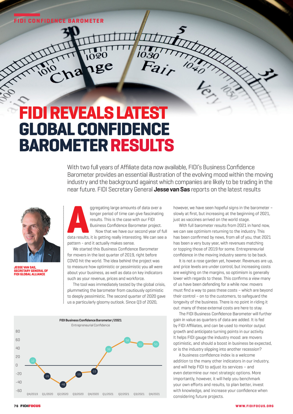 F ID I CO N FI DE NCE BAR O METER FIDI REVEALS LATEST GLOBAL CONFIDENCE BAROMETERRESULTS With two full years of Affiliate data now available, FIDIs Business Confidence Barometer provides an essential illustration of the evolving mood within the moving industry and the background against which companies are likely to be trading in the near future. FIDI Secretary General Jesse van Sas reports on the latest results A ggregating large amounts of data over a longer period of time can give fascinating results. This is the case with our FIDI Business Confidence Barometer project. Now that we have our second year of full data results, it is getting really interesting. We can see a pattern - and it actually makes sense. We started this Business Confidence Barometer for movers in the last quarter of 2019, right before COVID hit the world. The idea behind the project was to measure how optimistic or pessimistic you all were about your business, as well as data on key indicators such as your revenue, prices and workforce. The tool was immediately tested by the global crisis, plummeting the barometer from cautiously optimistic to deeply pessimistic. The second quarter of 2020 gave us a particularly gloomy outlook. Since Q3 of 2020, JESSE VAN SAS, SECRETARY GENERAL OF FIDI GLOBAL ALLIANCE FIDI Business Confidence Barometer / 2021 Entrepreneurial Confidence 80 60 58 51 40 50 38 20 12 0 -20 -40 -60 -19 -26 -15 -48 Q4/2019 Q1/2020 Q2/2020 Q3/2020 Q4/2020 76 FF305 Mar_May 22 pp76-77 Business Confidence Barometer.indd 76 Q1/2021/ Q2/2021 Q3/2021 Q4/2021 however, we have seen hopeful signs in the barometer slowly at first, but increasing at the beginning of 2021, just as vaccines arrived on the world stage. With full barometer results from 2021 in hand now, we can see optimism returning to the industry. This has been confirmed by news, from all of you, that 2021 has been a very busy year, with revenues matching or topping those of 2019 for some. Entrepreneurial confidence in the moving industry seems to be back. It is not a rose garden yet, however. Revenues are up, and price levels are under control, but increasing costs are weighing on the margins, so optimism is generally lower with regards to these. This confirms a view many of us have been defending for a while now: movers must find a way to pass these costs which are beyond their control on to the customers, to safeguard the longevity of the business. There is no point in riding it out: many of these external costs are here to stay. The FIDI Business Confidence Barometer will further gain in value as quarters of data are added. It is fed by FIDI Affiliates, and can be used to monitor output growth and anticipate turning points in our activity. It helps FIDI gauge the industry mood: are movers optimistic, and should a boost in business be expected, or is the industry slipping into another recession? A business confidence index is a welcome addition to the many other indicators in our industry, and will help FIDI to adjust its services and even determine our next strategic options. More importantly, however, it will help you benchmark your own efforts and results, to plan better, invest with knowledge, and increase your confidence when considering future projects. WW W.F I DI FO C US . O RG 08/03/2022 08:33